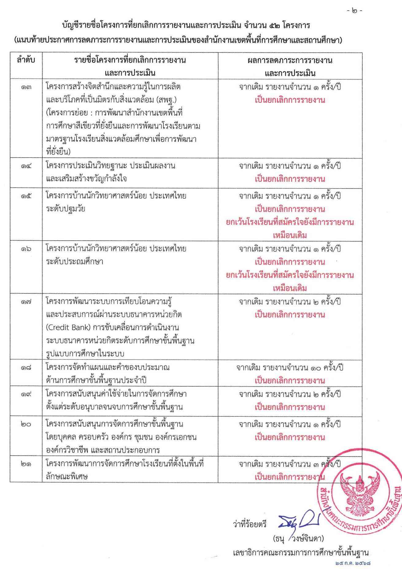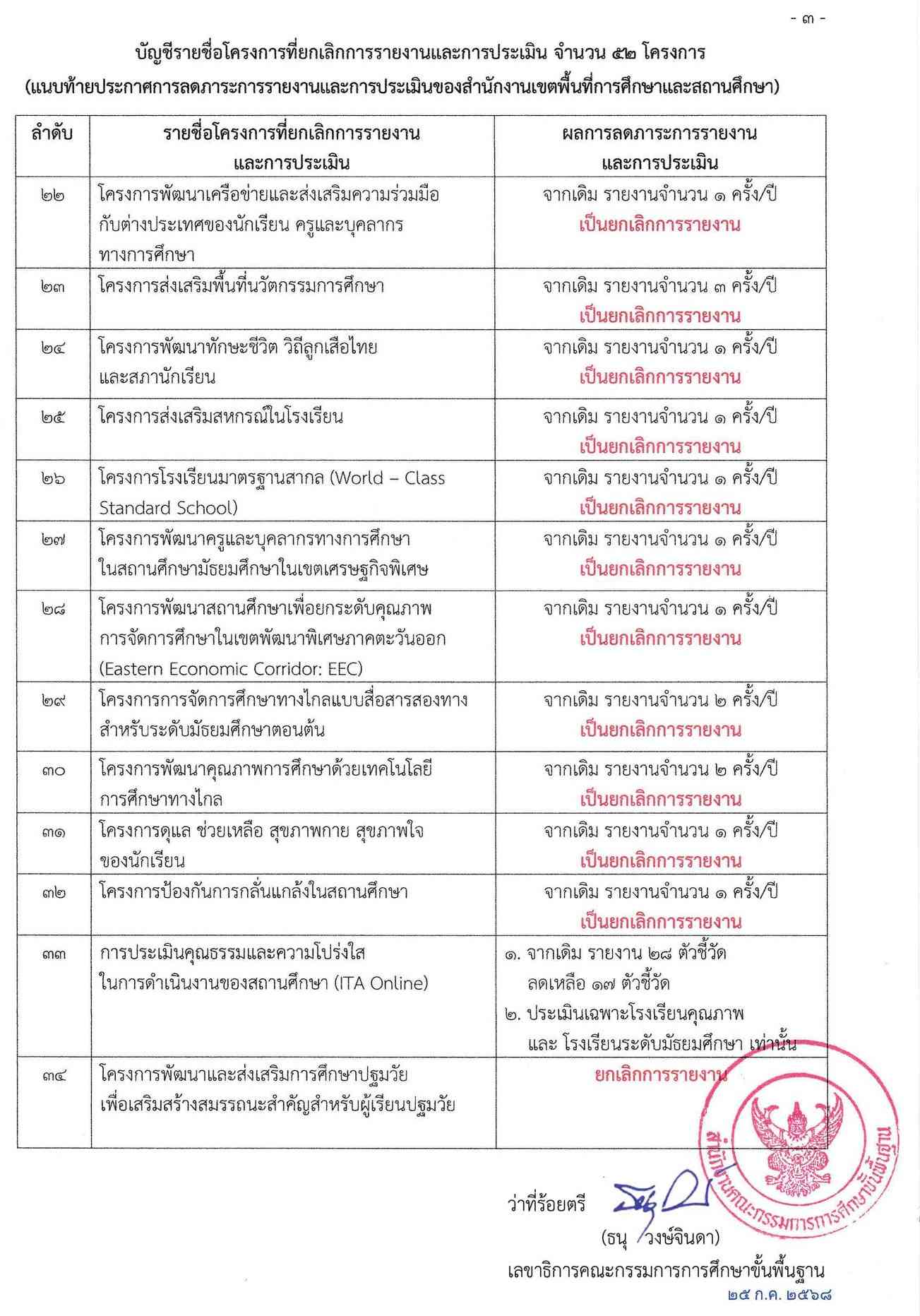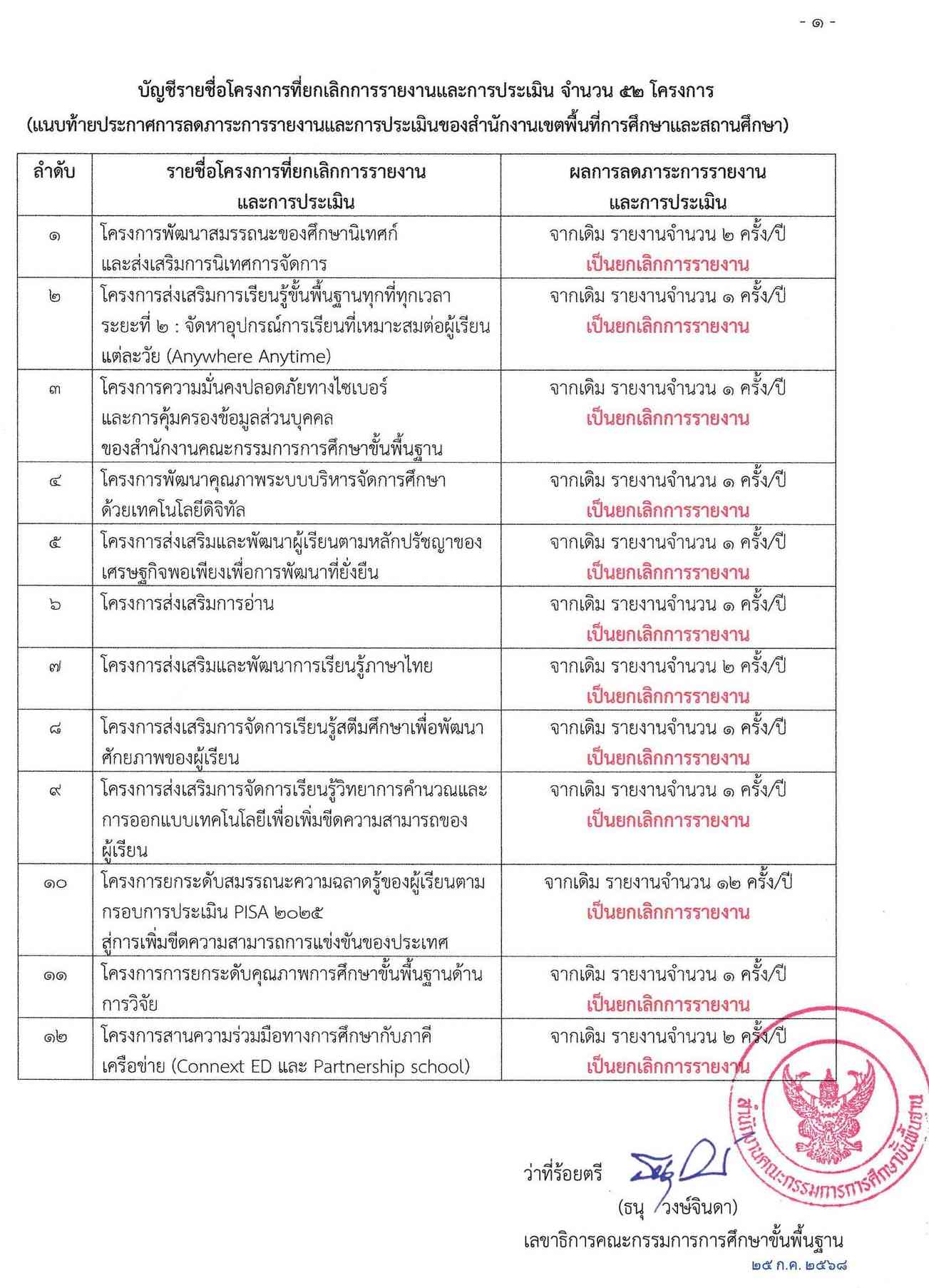 ยกเลิกการรายงาน ยกเลิกการรายงาน กเลิกการรายงาน ส่งผลให้ลดภาระที่ไม่จำเป็นและซ้ำซ้อน เรียนดี มีความสุข เพิ่มประสิทธิภาพ โดยมุ่งเน้นการจัดการเรียนการสอนและพัฒนาผู้เรียนได้เต็มศักยภาพ และมีประสิทธิภาพ มีทั้งหมด 52 โครงการ ตามรายชื่อโครงการที่ยกเลิกการรายงาน และการประเมิน ประกาศเมื่อ 25 กรกฎาคม 2568 มีดังนี้